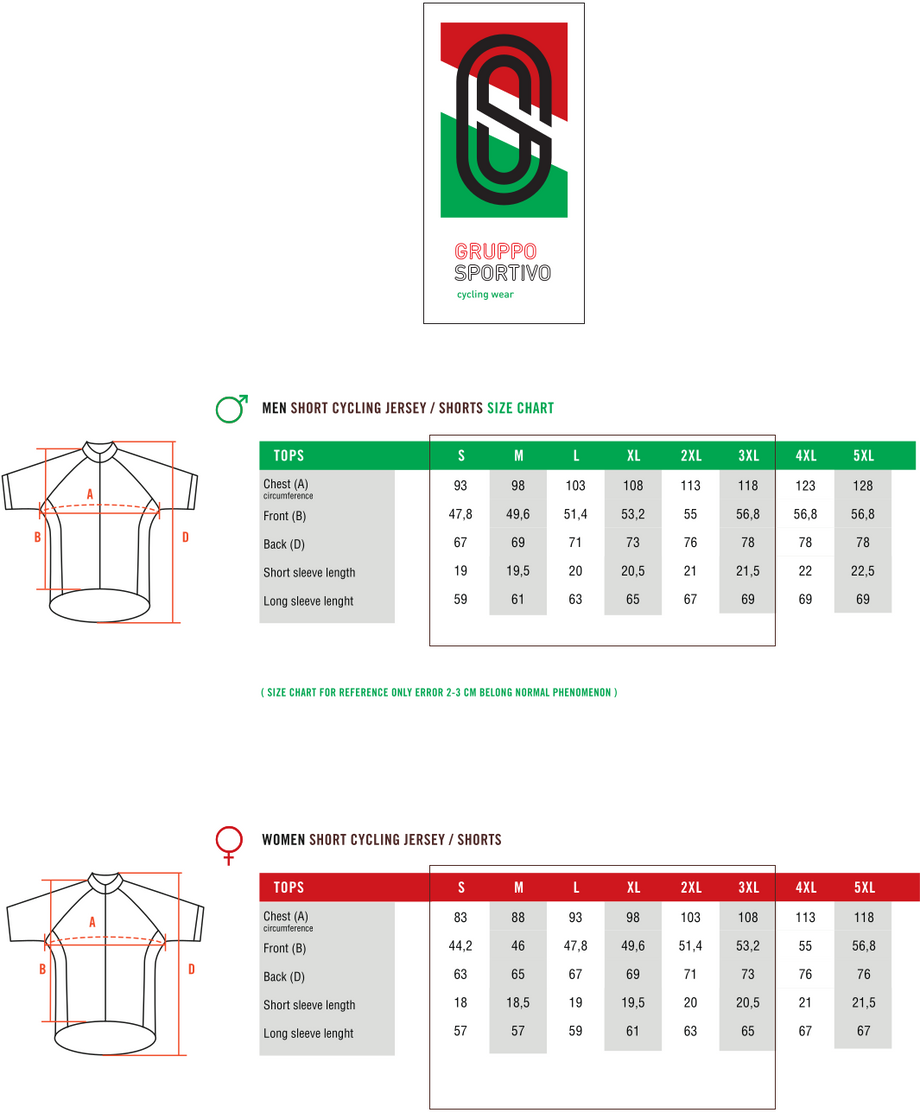 Let op Europese maatvoering! De wielershirts van Gruppo Sportivo hanteren de normale Europese maatvoering. Zie maattabel voor de afmetingen.